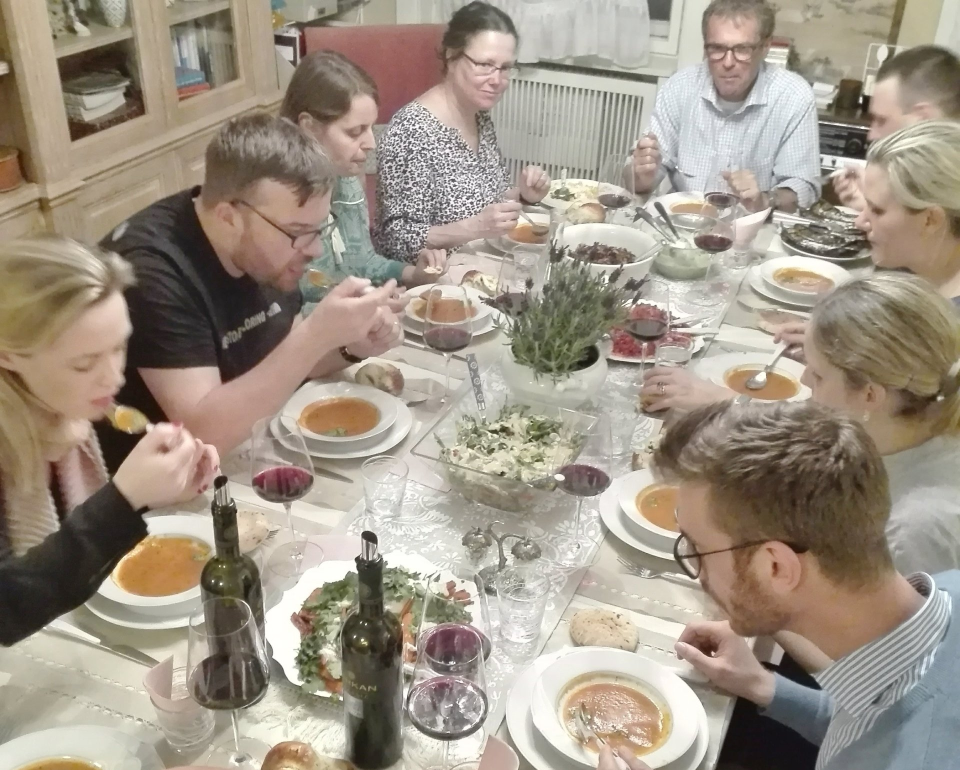 Wir bereiten gemeinsam 4-5 verschiedene Gerichte zu, und sitzen dann gemütlich bei Tisch.